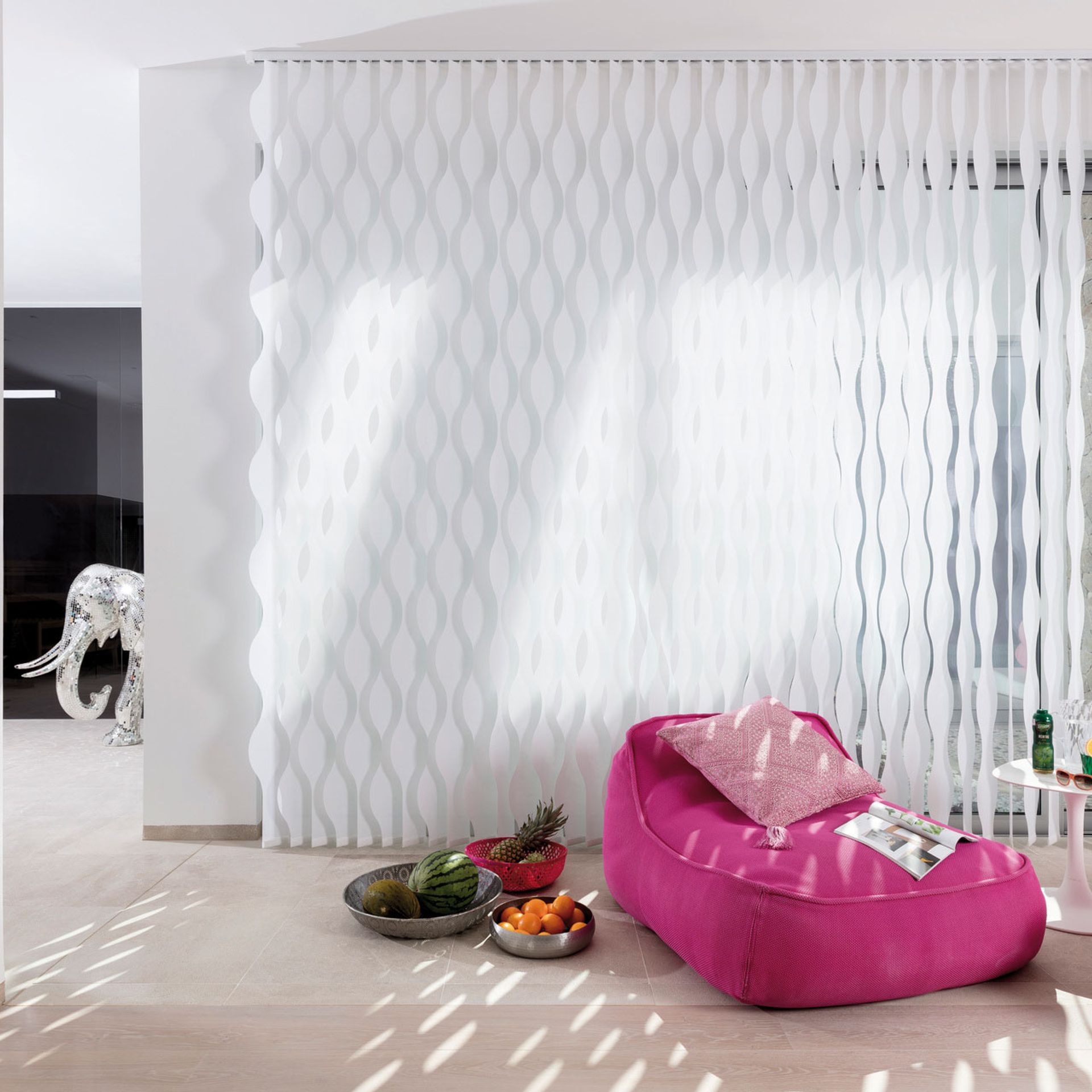 Wie wirkt ein Raum höher? Indem man das Vertikale betont. Diesem einfachen Gesetz folgt die Vertikaljalousie und schafft durch ihre großzügigen Lamellen ein Gefühl von Höhe, Freiheit und Luftigkeit. Sehr reduziertes Design und eine minimalistische Formensprache schaffen ein puristisches Ambiente, das Raum für Funktionalität lässt. Deshalb sind Lamellenvorhänge vor allem im Objektbereich und in der modernen Architektur sehr beliebt. Funktional sorgen sie für maximalen Sonnen- und Hitzeschutz, wobei durch die je nach Sonneneinstrahlung breiteren oder schmäleren Sichtschlitze - je nach Regulierung der Lamellen - für den nötigen Durchblick nach außen gesorgt und umgekehrt die Privatsphäre gesichert ist. Das Streulicht sorgt für ein angenehmes Lichtklima.